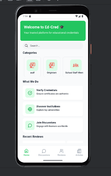 Developed a cross-platform mobile app for iOS & Android extending Ed-Cred’s web platform, enabling anonymous and verified educational reviews with secure authentication, push notifications, and offline access.